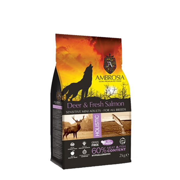 מזון יבש לכלב Ambrosia צבי וסלמון מיני 2 ק”ג
