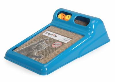 מתקן גירוד לחתול עם מסגרת מפלסטיק, בחלק העליון של המשטח שני כדורי משחק.